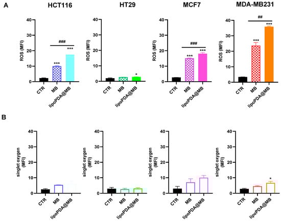 ROS (A) and singlet oxygen (B) production in HCT116, HT29, MCF7, and MDA-MB231 cell lines following incubation with equitoxic concentrations of MB and lipoPDA@MB, corresponding to their respective IC50 values, incubation with H2DCF-DA or siDMA and 2 min irradiation (500 W, mean ± S.D. of 3 independent experiments; * p < 0.05 and *** p < 0.001 vs. CTR; ## p < 0.01 and ### p < 0.001).