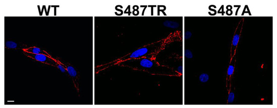 Confocal immunofluorescence microscopy to detect WT, S487TR, and S487A H1 receptors expressed in CHO cells. Red fluorescence shows WT, S487TR, and S487A H1 receptors labeled with anti-hemagglutinin (HA) antibodies. Blue fluorescence shows nuclei labeled with 4′,6-diamidino-2-phenylindole (DAPI). Scale bar 10 μm.