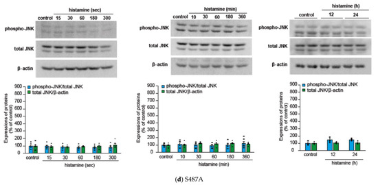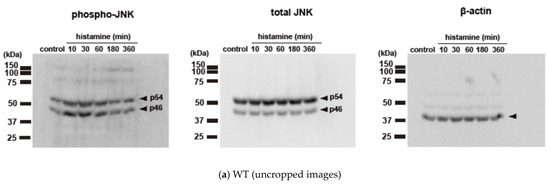 We initially evaluated the time course of histamine-induced JNK phosphorylation in CHO cells expressing WT, S487TR, and S487A (Figure 3), because our previous study suggested that Gq proteins and arrestins regulate the early and late phases of histamine-induced ERK phosphorylation, respectively [43]. In CHO cells expressing the WT receptors (Figure 3a,b), histamine-induced JNK phosphorylation occurred rapidly within 1 min and was maintained for 60 min. In CHO cells expressing S487TR (Figure 3c), histamine-induced JNK phosphorylation occurred rapidly within 3 min and was maintained for 60 min. In contrast, in CHO cells expressing S487A (Figure 3d), histamine failed to induce significant JNK phosphorylation during the period examined (up to 24 h). Thus, JNK phosphorylation was induced by histamine in CHO cells expressing WT and S487TR but not in those expressing S487A. These results suggest that histamine-induced JNK phosphorylation is mediated by Gq proteins, but not by arrestins, in CHO cells. It is possible that the relatively slower and lower level of phosphorylated JNK in CHO cells expressing S487TR compared to WT might be due to the lower expression level of S487TR compared to WT in these CHO cells, since our previous study indicated that the expression levels of WT, S487TR, and S487A in these CHO cells were approximately 300, 150, and 400 fmol/mg whole cell protein, respectively [42]. It is noted that p46 phosphorylation appeared to precede p54 phosphorylation in response to histamine (Supplemental Figure S2). Uncropped immunoblot images obtained from four independent experiments are shown in Supplemental Figure S3.
