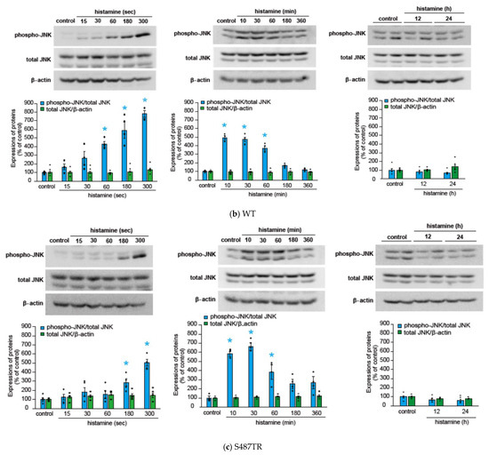 In subsequent experiments, we evaluated the effects of various inhibitors on JNK phosphorylation induced by histamine treatment for 30 min in CHO cells expressing WT or S487TR.