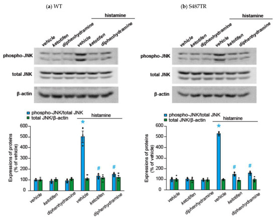 Effects of histamine H1 receptor antagonists on histamine-induced JNK phosphorylation. CHO cells expressing WT (a) and S487TR (b) were stimulated with or without 100 µM histamine for 30 min in the presence and absence (vehicle) of histamine H1 receptor antagonists, ketotifen (1 mM) or diphenhydramine (1 mM). Subsequently, protein extracts from the cells were subjected to immunoblot analyses. Typical immunoblot images of phosphorylated JNK (phospho-JNK), total JNK, and β-actin are shown in the upper panels in (a,b). Histamine-induced changes in the ratios of phosphorylated JNK to total JNK (phospho-JNK/total JNK) and total JNK to β-actin (total JNK/β-actin) are shown as percentages of the control (vehicle) without histamine treatment in the lower graphs in (a,b). Assays were repeated four times. Values represent mean ± SE of data obtained from four independent protein samples. Individual data are shown as scatter plots. * p < 0.05 vs. vehicle, # p < 0.001 vs. histamine (vehicle); one-way ANOVA and Tukey’s test.