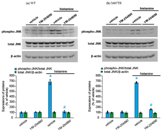 Effects of Gq protein inhibitor on histamine-induced JNK phosphorylation. CHO cells expressing WT (a) and S487TR (b) were stimulated with or without 100 µM histamine for 30 min in the presence and absence (vehicle) of a Gq protein inhibitor, YM-254890 (20 µM). Subsequently, protein extracts from the cells were subjected to immunoblot analyses. Typical immunoblot images of phosphorylated JNK (phospho-JNK), total JNK, and β-actin are shown in the upper panels in (a,b). Histamine-induced changes in the ratios of phosphorylated JNK to total JNK (phospho-JNK/total JNK) and total JNK to β-actin (total JNK/β-actin) are shown as percentages of the control (vehicle) without histamine treatment in the lower graphs in (a,b). Assays were repeated twice. Values represent mean ± SE of data obtained from four independent protein samples. Individual data are shown as scatter plots. * p < 0.05 vs. vehicle, # p < 0.05, vs. histamine (vehicle); one-way ANOVA and Tukey’s test.