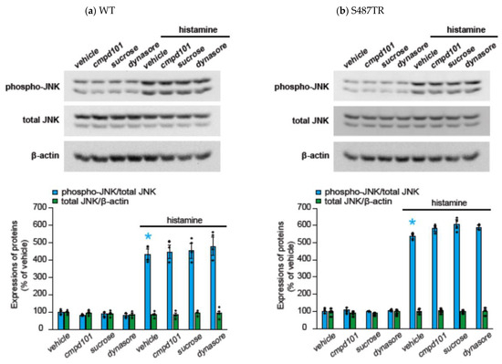 Effects of inhibitors against GRK, clathrin, and dynamin on histamine-induced JNK phosphorylation. CHO cells expressing WT (a) and S487TR (b) were stimulated with or without 100 µM histamine for 30 min in the presence and absence (vehicle) of an inhibitor of GRK2/3 (cmpd101; 30 µM), clathrin (a high concentration of sucrose; 0.32 M), or dynamin (dynasore; 100 µM). Subsequently, these protein extracts from the cells were subjected to immunoblot analyses. Typical immunoblot images of phosphorylated JNK (phospho-JNK), total JNK, and β-actin are shown in the upper panels in (a,b). Histamine-induced changes in the ratios of phosphorylated JNK to total JNK (phospho-JNK/total JNK) and total JNK to β-actin (total JNK/β-actin) are shown as percentages of the control (vehicle) without histamine treatment in the lower graphs in (a,b). Assays were repeated four times. Values represent mean ± SE of data obtained from four independent protein samples. Individual data are shown as scatter plots. * p < 0.05 vs. vehicle; one-way ANOVA and Tukey’s test.