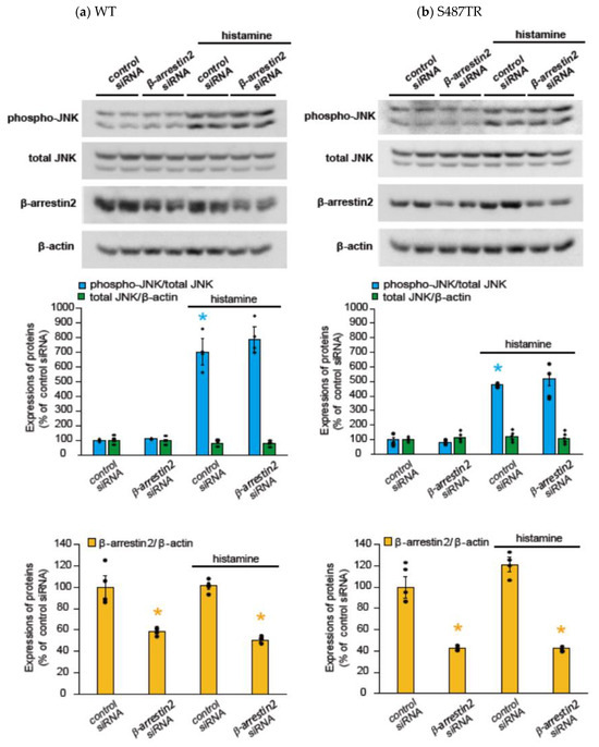 Effects of β-arrestin2 knockdown on histamine-induced JNK phosphorylation. CHO cells expressing WT (a) and S487TR (b) were treated with control siRNA or β-arrestin2 siRNA for 48 h and then stimulated with or without 100 µM histamine for 30 min. Protein extracts from the cells were then subjected to immunoblot analyses. Typical immunoblot images of phosphorylated JNK (phospho-JNK), total JNK, β-arrestin2, and β-actin are shown in the upper panels in (a,b). Histamine-induced changes in the ratios of phosphorylated JNK to total JNK (phospho-JNK/total JNK) and total JNK to β-actin (total JNK/β-actin) are shown in the middle graphs, and the expression levels of β-arrestin2 are shown in the lower graphs in (a,b). Assays were repeated twice. Values represent mean ± SE of data obtained from four independent protein samples. Individual data are shown as scatter plots. * p < 0.05, * p < 0.05 vs. control siRNA without histamine treatment; one-way ANOVA and Tukey’s test.