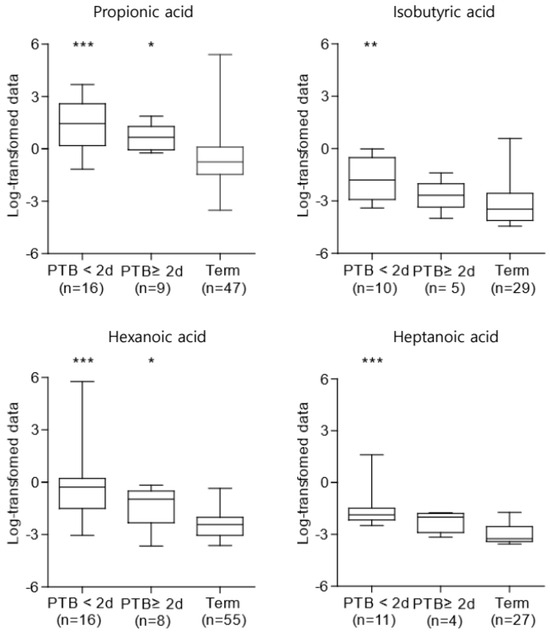 We represented the possibility of propionic acid, isobutyric acid, hexanoic acid, and heptanoic acid as markers in CVF using the GC–MS method for the PTB vs. TB group in clinical practice and found that they were associated with indicators of other inflammatory responses and were related to PTB. In particular, immediate birth within 2 days after the onset of symptoms, such as PTL, was significantly associated with higher concentrations of the SCFAs.
