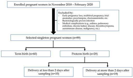 This nested case–control study was conducted on pregnant women who delivered at Ewha Womans University Mokdong Hospital from 1 November 2018 to 29 February 2020. The 89 participants were divided into two groups: 29 cases of PTB and 60 controls. Furthermore, the PTB group was divided into two subgroups based on birth timing after CVF sampling: delivery ≤2 days after sampling (n = 10) and ≥2 days after sampling (n = 19) (Figure 3). Women with obstetric pregnancy complications (e.g., early pregnancy loss, multifetal pregnancy, fetal anomalies, preeclampsia, chorioamnionitis) and non-obstetric complications (e.g., bacteriologically proven infection, asthma, pulmonary embolism, chronic kidney disease, thrombocytopenia, autoimmune disease, malignancy, etc.) were excluded. This study’s protocol was approved by the Institutional Review Board (IRB) of the Ewha Womans University Mokdong Hospital (IRB No. EUMC 2018-07-007). Written informed consent was obtained from all participants at enrollment, and the consent procedure was approved by the IRB.