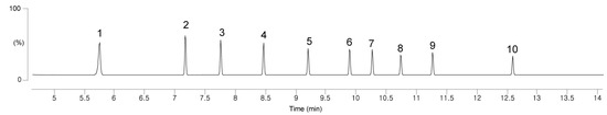 GC–MS chromatogram of blank sample spiked with SCFAs and an internal standard. (1) acetic acid, (2) propionic acid, (3) isobutyric acid, (4) butyric acid, (5) isovaleric acid, (6) valeric acid, (7) 2-ethyl butyric acid (internal standard), (8) 4-methyl valeric acid, (9) hexanoic acid, (10) heptanoic acid.