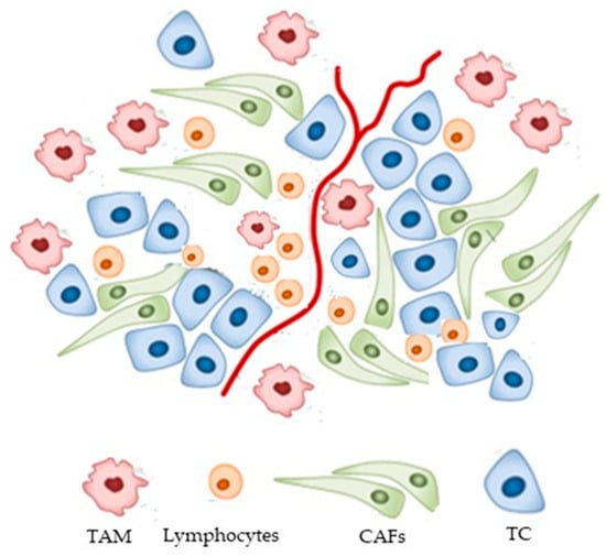 Schematic description of the TME. Abbreviations: tumor-associated macrophage (TAM), cancer-associated fibroblast (CAFs), tumor cells (TC).