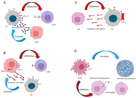 Immune checkpoints PD-L1 and PD-1 expression and function in macrophage and tumor cells (TC). (A) TAMs can indirectly inhibit immune activation by enhancing the PD-L1 expression on TCs through the release of exosomes and anti-inflammatory cytokines. PD-L1 expressed on TCs binds to PD-1 expressed on T cells and inhibits the cytotoxic effects of T cells. (B) TAMs can directly inhibit immune activation because they increase their expression of PD-L1 as a result of phagocytosis of PD-L1-carrying exosomes produced by TCs. (C) M1 macrophage can directly inhibit tumor growth by inhibiting PD-L1 expression in TCs through the release of exosomes carrying miR 16-5p. (D) PD-1-expressing TAMs inhibit macrophage phagocytosis and promote tumor growth and metastasis.