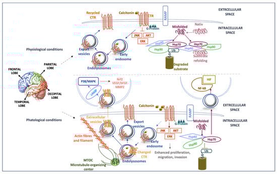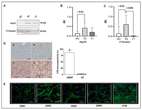 Alberti, G.; Sánchez-López, C.M.; Marcilla, A.; Barone, R.; Caruso Bavisotto, C.; Graziano, F.; Conway de Macario, E.; Macario, A.J.L.; Bucchieri, F.; Cappello, F.; et al. Hsp70 and Calcitonin Receptor Protein in Extracellular Vesicles from Glioblastoma Multiforme: Biomarkers with Putative Roles in Carcinogenesis and Potential for Differentiating Tumor Types. Int. J. Mol. Sci. 2024, 25, 3415. https://doi.org/10.3390/ijms25063415