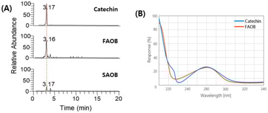 HPLC chromatograms of freeze-dried AOB (FAOB) and spray-dried AOB (SAOB). (A) HPLC chromatograms of catechin and two AOB extract samples. (B) Respective DAD spectra of the peaks with the same retention time. The red dotted line on the HPLC chromatogram represents the same retention time.