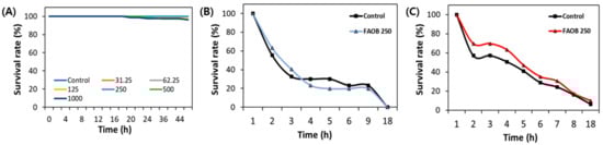 To determine the safe concentrations of AOB, an acute toxicity test was conducted with different concentrations (31.25–1000 μg/mL) of AOB. As a result, various tested concentrations of FAOB did not statistically show any difference in survival rates. However, survival rates decreased by 2% and 4% at 500 and 1000 μg/mL FAOB, respectively. Thus, safe concentrations (62.5, 125, and 250 μg/mL) of FAOB were used in subsequent experiments (Figure 2A). Also, FAOB at 250 μg/mL did not affect the survival of nematodes compared to the control, even under oxidative and heat stress conditions (Figure 2B,C).