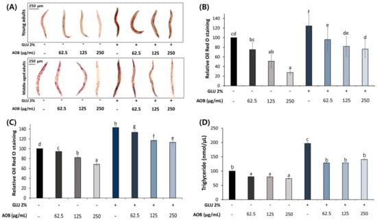 We examined the effect of AOB on fat accumulation in young and middle-aged adult worms. AOB showed a concentration-dependent decrease in total fat accumulation compared to the control under normal and 2% GLU diet conditions in young adult worms (Figure 3B).