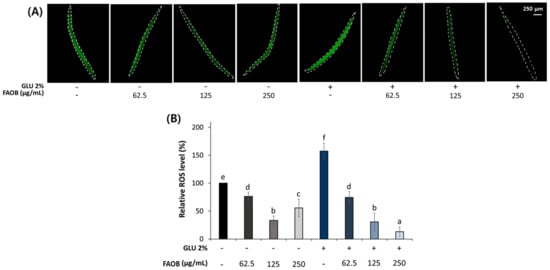 ROS are metabolites that cause aging, and it has been reported in previous studies that a high-GLU diet causes ROS accumulation []. FAOB exhibited a reduction effect on ROS production in both young and middle-aged worms (Figure 4).