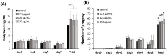 The adult worms that were in culture were suspended in 500 μL of M9 buffer containing a 0.05% Tween-20 solution. Then, they were homogenized on ice for 5 min using a glass homogenizer (ALLSHENG, Hangzhou, China) to collect the pellet, which was subsequently centrifuged at 1000× g for 5 min. The obtained supernatant was analyzed for TG content. The TG content was measured via absorbance at 570 nm using a TG kit (Biomax, Gyeonggi-do, Republic of Korea).