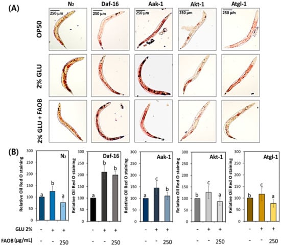 To investigate whether AOB regulates lipid metabolism in middle-aged worms under GLU feeding conditions, the total fat contents were analyzed using N2, daf-16, aak-1, akt-1, and atgl-1 knockdown worms. Although body fat reduction was found in the FAOB-treated group in wild-type N2 worms, such an effect of FAOB was not seen in daf-16 worms (Figure 6). Other worm strains had statistically reduced body fat by FAOB treatment, similar to N2. This means that the inhibitory effect of FAOB on body fat accumulation from a GLU diet depends on daf-16.