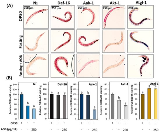 The effect of AOB on lipolysis alters depending on lipid metabolism-related factors under fasting conditions. (A) Images of stored body fat in various worm strains under fasting conditions. (B) Quantification results of total lipids in various worm strains under fasting conditions. Bars represent the means ± SDs of three separate experiments (n = 3 plates and 10 randomly selected worms were used). Different letters above the bars mean statistically significant differences (p < 0.05). “-” means untreated, and “+” means treated.