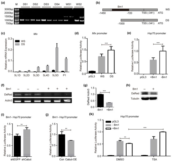Diversity and activity analyses of Mlx upstream regulatory sequence. (a) Cloning of Mlx upstream regulatory region in domesticated silkworms (DS1-4) and wild silkworms (WS1-2). (b) Diagram of Mlx upstream regulatory region in domesticated and wild silkworms. (c) Comparing the expression of Mlx gene in the 5th instar and pupal stage of the fat body in domesticated and wild silkworms. 5L1D: the 1st day of the 5th instar, 5L2D: the 2nd day of the 5th instar, 5L3D: the 3rd day of the 5th instar, 5L4D: the 4th day of the 5th instar, 5L5D: the 5th day of the 5th instar, P1: the 1st day of the pupal stage. (d) Activity of Mlx upstream regulatory region was examined via a dual-luciferase reporter assay in domesticated and wild silkworms. (e) Presence of Bm1 repressed the transcriptional activity of the Hsp70 promoter. Bm1 was inserted before the luciferase gene driven by the Hsp 70 promoter. (f–h) Bm1 decreased the expression of DsRed detected using semiquantitative PCR and Western blot. Bm1 was inserted before the DsRed gene, driven by the A4 promoter. (i,j) Cabut affected the transcriptional repression associated with Bm1. Decreasing the expression of Cabut increased the transcriptional activity of the Hsp 70 promoter when Bm1 was present, increasing the expression of Cabut has the opposite effect. (k) Treatment with 1 μM TSA can release the transcriptional repression associated with Bm1. Error bars show the SD. Significant differences: ** p < 0.01, *** p < 0.001.