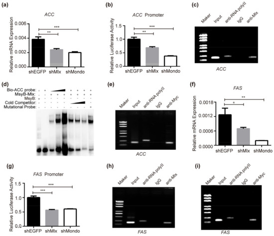 Mondo-Mlx regulates the expression of lipogenic genes. (a,b) RNAi of Mlx or Mondo reduced the expression and promoter transcriptional activity of ACC in BmNs cells. (c,d) ChIP-PCR and ENSA with Mlx overexpression in BmNs cells. Specific primers covering the ChoRE element of the ACC promoter were used for ChIP-PCR. Prokaryotically expressed Mlx-MsyB fusion protein was purified, and specific biotinylated probe based on the ChoRE element of the ACC promoter for EMSA was designed. (e) ChIP-PCR assay in BmNs cells with Mondo-Myc overexpression. Specific primers covering ChoRE element of the FAS promoter were used. (f,g) Expression and promoter transcriptional activity of FAS was decreased when Mlx or Mondo interfered with the shRNA in BmNs cells. (h,i) ChIP-PCR assay of the direct binding of Mlx or Mondo to the ChoRE element of the FAS promoter in BmNs cells. Error bars show SD. Significant difference: * p < 0.05, ** p < 0.01, *** p < 0.001.