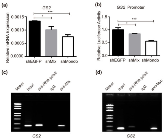 The non-essential amino acids glutamate and glutamine play an essential role in amino acid and energy metabolism [74]. Mattila J. found that glutamate/glutamine biosynthetic genes were induced by Mlx in high sugar feeding, and the promoter of the GS2 was bound by Mlx in flies [33]. When interfering with Mlx or Mondo in BmNs cells, the expression of GS2 was decreased (Figure 4a). The dual-luciferase reporter assay showed that GS2 promoter activity is regulated by Mlx and Mondo (Figure 4b). After the overexpression of Mlx or Mondo-Myc, the ChIP-PCR results showed that genome fragments could be immunoprecipitated by Mlx or Myc antibodies, respectively, and amplified a single specific band (Figure 4c,d), indicating that Mondo-Mlx can specifically bind to the GS2 promoter. The above results show that Mondo-Mlx can directly regulate the transcription of GS2, thereby regulating the synthesis of glutamine. Taken together, the biosynthesis of glutamine needs to be coordinated with sugar metabolism in order to maintain the optimal growth state of silkworm. Mondo-Mlx is a central regulator in this process.