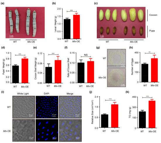 Effects of overexpression of Mlx (Mlx-OE) in transgenic silkworms. (a,b) Comparison of body size and larval weight of wild-type silkworm (WT) and Mlx-OE on the fifth day of fifth instar. (c–h): Investigation of pupal and cocoon size (c), pupal weight (d), cocoon shell weight (e), cocoon shell ratio (f), and egg number between (g,h) Mlx-OE and WT. (i–k) Analysis of size (i,j) and triglyceride content (k) of fat body cells in Mlx-OE and WT on the fifth day of the fifth instar. Error bars show SD. Significant differences: ** p < 0.01; *** p < 0.001; NS, no significant difference.