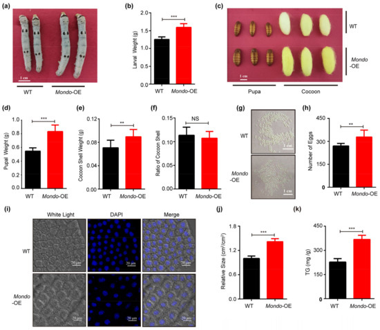 Phenotypic analysis of Mondo overexpression (Mondo-OE) in transgenic silkworms. (a–h) Investigation of larval growth and body weight (a,b), pupal and cocoon size (c), pupal weight, cocoon shell weight and ratio (e,f), and egg number (g,h) of Mondo-OE and WT. (i–k) Detection of size (i,j) and triglyceride content (k) of fat body cells in Mondo-OE and WT on the fifth day of the fifth instar. Error bars show SDs. Significant differences: ** p < 0.01; *** p < 0.001; NS, no significant difference.