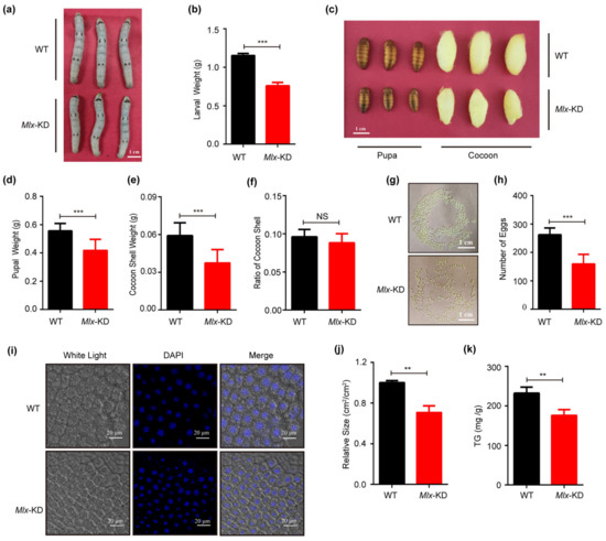 Effects of Mlx knock-down (Mlx-KD) in transgenic silkworms. (a–h): Analysis of larval size and weight (a,b), pupal and cocoon size (c), pupal weight (d), cocoon shell weight and ratio (e,f), and egg number (g,h) between Mlx-KD and WT. (i–k) Test of size (i,j) and triglyceride content (k) of fat body cells in Mlx-KD and WT on the fifth day of the fifth instar. Error bars show SD. Significant differences: ** p < 0.01; *** p < 0.001; NS, no significant difference.