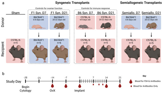 Experimental Design. (a) Ovarian tissue from mice, either 6–8 (D7 groups) or 20–22 days old (D21 groups), was transplanted subcutaneously into ovariectomized adult mice. To ensure the volume of transplanted tissue was equal across all subjects, D7 groups received two whole ovaries and D21 groups received two quarter ovaries. Syngeneic transplants were performed with both C57BL/6 (B6) mice (serving as controls for host immune response) and B6CBAF1 (F1) mice (serving as controls for ovarian endocrine function). For semi-allogeneic transplants, B6 hosts received ovarian tissue from F1 pups. Vaginal cytology was collected from 2 weeks before ovariectomy to 21 days after transplant. (b) Blood was collected at specified time points for analysis of serum follicle-stimulating hormone (FSH) and/or donor-specific Immunoglobulin G (IgG).