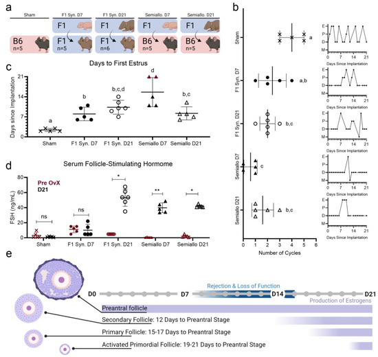 Restoration of endocrine function after ovarian transplantation in syngeneic (Syn) and semiallogeneic (semiallo) hosts (a) Schematic of groups for which ovarian function was compared. (b) Number of cycles and representative traces of estrus cycles following ovarian transplant (E = estrus, M = metestrus, D = diestrus, and P = proestrus). Rejection of ovarian tissue in semi-allogeneic groups resulted in fewer estrus cycles observed in these hosts. Bars indicate mean ± SD. Statistical significance was determined using the Kruskal–Wallace test and Dunn’s correction for multiple comparisons with p < 0.05, letters represent statistically significant differences, where groups that share a letter are not sta-tistically significantly different and groups that do not share a letter are statistically significantly different at a p value of at least 0.05 (c) Days elapsed between ovarian transplant and resumption of estrous cyclicity. Bars indicate median ± IQR and red points indicate mice that never entered estrus (censored subjects). Log-rank tests were performed on the Kaplan Meier Survival curves of each group with p < 0.05 used to determine statistical significance. (d) Serum FSH before ovariectomy (red) and 21 days after ovarian transplant (black). Only D7 syngeneic transplants were capable of suppressing FSH secretion to pre-OvX levels. Bars indicate mean ± SD. Statistical significance was determined using the Kruskal–Wallace test with ns representing p < 0.05, * representing 0.01 < p < 0.05, and ** representing 0.001 < p < 0.01. (e) Comparison of time required for follicles at different developmental stages to begin producing estrogens with time required for rejection or impaired graft function. D21 ovaries contain preantral follicles and are capable of secreting estrogens at the time of transplant. D7 ovaries contain only immature follicles and may not reach sufficient maturity to induce cyclicity before immune rejection and loss of tissue function.