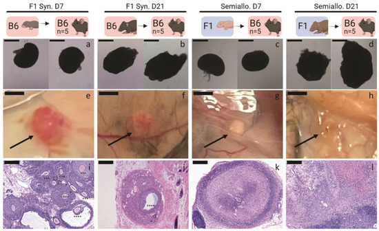We analyzed revascularization of the implanted ovarian tissue by histological analysis of the retrieved grafts. Syngeneic D7 (Figure 3e) and D21 (Figure 3f) ovarian tissue retrieved 21 days after transplantation appeared pink, indicating healthy, revascularized tissue. Healthy follicles at various stages of development were present in histological images (Figure 3i,j). Conversely, semi-allogeneic D7 (Figure 3g) and D21 (Figure 3h) ovarian tissue appeared white and shrunken, suggesting limited revascularization and also tissue necrosis. Consistent with the transient ovarian function observed in mice who received semi-allografts, we did not identify healthy follicles in histological sections of semi-allogeneic grafts (Figure 3k,l).