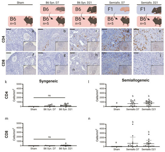 Presence of CD4+ and CD8+ cells at the graft site for syngeneic (Syn) and semiallogeneic (semiallo) transplants. (a–j) Immunohistochemical staining of explanted ovarian grafts. Brown staining indicates cells positive for CD4 (a–e) or CD8 (f–j); scale bars = 50 μm, insets = 200 μm. (k–n) Density of CD4 and CD8 positive cells at the graft site. Semi-allogeneic grafts had significantly increased densities of CD4+ (i) and CD8+ cells. (n) T cell comparison with native ovaries. This increased T cell density is consistent with cell-mediated rejection at the site of transplant. In contrast, neither CD4+ (k) nor CD8+ (m) T cell densities were significantly elevated in syngeneic grafts compared to the native ovary. Bars indicate mean ± SD. Statistical significance was determined using the Kruskal–Wallace test and Dunn’s correction for multiple comparisons with p < 0.05 considered significant, ns represents p > 0.05, letters represent statistically significant differences, where groups that share a letter are not statistically significantly different and groups that do not share a letter are statis-tically significantly different at a p value of at least 0.05.