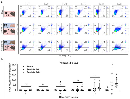 Production of allospecific antibodies after ovarian transplantation to semiallogeneic (semiallo) hosts. Flow cytometry of donor thymocytes incubated with host serum was used to evaluate the production of donor-specific Immunoglobulin M (IgM) and Immunoglobulin G (IgG) after ovarian transplant. (a) Representative scatterplots for each group demonstrate an increase in allospecific antibodies in host serum over the 21 days following ovarian allotransplants; x-axis = (IgG), y-axis = (IgM). (b) Presence of IgG in host serum as measured by mean fluorescence intensity (MFI). Allospecific IgG was detectable in the serum of a subset of semi-allogeneic (semiallo) hosts as early as 12 days post-transplantation. Overall, 80% of D7 and 100% of D21 subjects who received semi-allogeneic implants mounted a detectable allospecific antibody by 21 days post-transplantation. The fluorescence intensity for each subject is normalized to the value recorded at D0. Bars indicate mean ± SD. Statistical significance was determined using the Kruskal–Wallace test and Dunn’s correction for multiple comparisons with p < 0.05 considered significant, ns represents p > 0.05, letters represent statistically significant differences, where groups that share a letter are not statistically significantly different and groups that do not share a letter are statis-tically significantly different at a p value of at least 0.05.