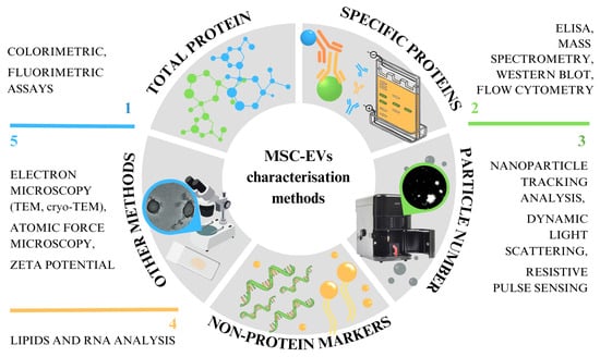 The first minimal requirements for EVs were published in 2014, co-authored by the International Society for Extracellular Vesicles (ISEV) Board and now referred to as the Minimal Information for Studies of Extracellular Vesicles (MISEV2014) []. This was followed by a lengthier, more comprehensive document in 2018 and recently in 2024 [,]. The MISEV2023 guidelines have been drawn up with the help of 1051 co-authors from 53 countries. The EV-TRACK program also offers an open-access platform for the recording of crucial data for EV publications [,]. However, these guidelines are for EVs in general, not specifically for MSC-derived EVs. Many methods have been developed and implemented to allow MSC-derived EV characterisation, but none of these techniques enable their complete characterisation. This review highlights the methods currently used to analyse MSC-derived EVs (Figure 1). These methods allow total and specific protein amount determination, particle number and size determination, the detection of non-protein markers like lipids and RNA, microscopy and others. Besides briefly describing the protocols, we summarise the experience and findings of different groups analysing MSC-derived EVs applied in science and clinical applications.