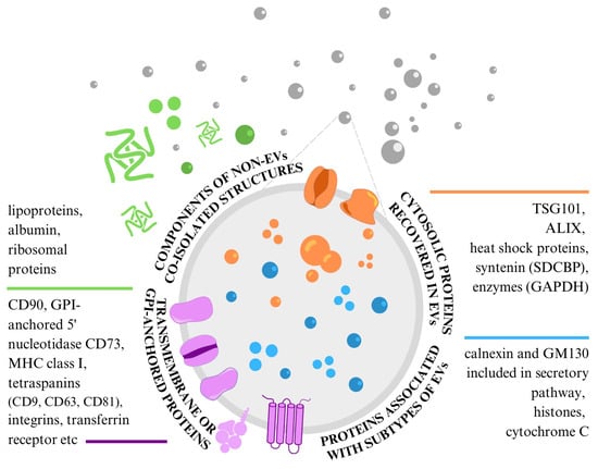 Western blotting and flow cytometry are the most used methods to determine the specific proteins in EV samples. To prove the presence of EVs in samples, three categories of EV markers that must be analysed have been proposed [] (Figure 3). At present, we do not have a standard marker that would enable the identification and characterisation of all extracellular vesicles in samples, because none of them are specifically expressed on MSC-EVs (both exosomes and microvesicles) [,]. Therefore, it is necessary to analyse at least one protein from each of the following categories: (1) transmembrane or GPI-anchored proteins localised at the external membranes of cells or MVs; (2) cytosolic proteins or periplasmic proteins; and (3) major components of non-EV structures often co-isolated with EVs. Proteins in the first category present the unique lipid bilayer structures of EVs. Proteins in the second category determine the intracellular material within the same structure, and proteins in the third category confirm the EV sample’s purity level. Two additional categories enable the evaluation of proteins specific to the identification of small EV subtypes [].