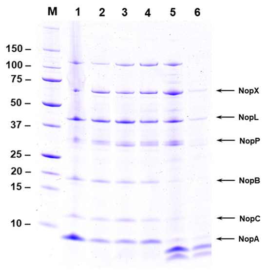 Sinorhizobium fredii NGR 234, S. fredii USDA257, and S. fredii HH103 secretes several nodulation outer proteins (Nops) into the extracellular milieu, when grown in the presence of flavonoids in the growth media [19,22,23]. In a previous work, it has been demonstrated that flavonoid-induced S. fredii USDA257 cultures in the presence of increasing amounts of calcium-reduced Nops production secreted into the extracellular media [21]. In this work, we decided to investigate whether this reduction also occurs in NGR234. For this purpose, we isolated NGR234 Nops produced in the presence of 1 µM of apigenin and increasing levels of Ca2+ and analyzed them by SDS-PAGE and subsequent silver staining (Figure 1). When NGR 234 was grown in the presence of 1 µM apigenin without any added calcium, several Nops including NopX, NopL, NopP, NopB, NopC, and NopA accumulated in the extracellular milieu (Figure 1). Interestingly, the addition of 1 mM Ca2+ to the growth medium resulted in a drastic reduction in the Nops accumulation observed when NGR 234 was grown in the presence of 1 mM calcium (Figure 1). A densitometer scan of the stained gel clearly demonstrated the severe reduction of Nops accumulation in culture media containing 1 mM Ca2+ (Supplementary Figure S1).