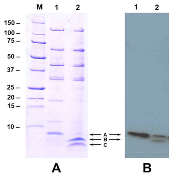- Laemmli, U.K. Cleavage of structural proteins during the assembly of the head of bacteriophage T4. Nature 1970, 227, 680–685. [Google Scholar] [CrossRef] [PubMed]