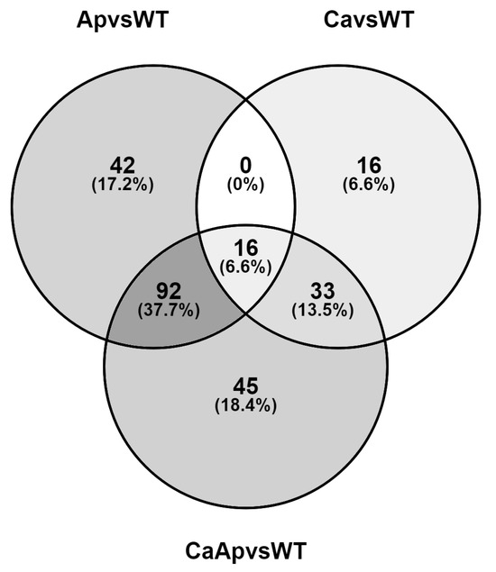 Venn diagram showing the overlap of differentially expressed genes among the calcium, apigenin, and calcium-plus-apigenin treatments with respect to the control condition. The diagram shows the number of uniquely regulated genes and the number of commonly regulated genes in each treatment compared to the control condition.
