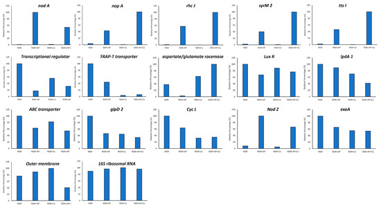 Previous transcriptomic studies carried out in the presence of inducer flavonoids demonstrated a profound effect on the global gene expression in several rhizobia and have identified numerous differentially expressed genes [18]. Most of the genes that are upregulated upon flavonoid treatment were located on the symbiotic plasmids while a limited number of genes of this plasmid were also down regulated [24,25]. In accordance with previous reports, we also found that apigenin regulated the expression of 150 genes, out of which 131 were upregulated and 19 were downregulated (Table 1). The upregulated genes included several nod genes involved in NF production (nodABC, nodS, nodU, nodZ), genes involved in the type III secretion system (rhcJ, nolU, rhcQ, rhcR, rhcS, rhcT, rhcV, rhcU), and genes encoding Nops (nopA, nopB, nopL, nopP, nopT, nopC, nopM). These DEGs can be grouped into different classes, namely, genes controlled by a nod box (NB), tts box (TB), and genes that do not contain either NBs or TBs [25]. In the case of Sinorhizobium fredii NGR234, 19 NBs (NB1 to NB19) have been identified; 18 out of these 19 NBs were inducible by flavonoid in a NodD1-dependent manner. The induction of four NB-containing genes was found to be dependent on NodD2 [26,27]. Our transcriptome analysis of NGR234 also clearly showed that several nod genes were highly induced by the addition of apigenin (Supplementary Dataset S1). We also analyzed the genes whose expression is driven by the 19 NBs described in NGR234 [28] and the 7 TBs located on the symbiotic plasmid. Clearly, the addition of apigenin upregulated the expression of all the 19 NB- and 7 TB-containing genes (Table 3 and Table 4).
