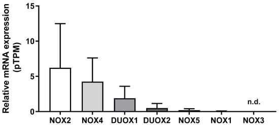 NADPH oxidases mRNA levels in the breast. Differences among NOX family mRNA levels in normal breast tissue. Data were obtained from the online platform Human Protein Atlas (https://www.proteinatlas.org, accessed on 2 July 2022). Results are represented as the mean protein-coding transcripts per million (pTPM) ± standard deviation (N = 290; n.d.: not detectable).