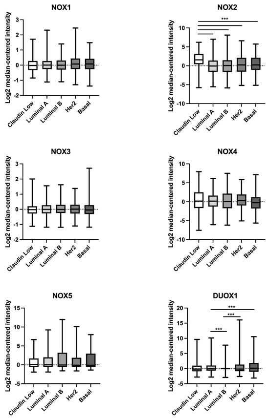 Comparison of NOX1, NOX2, NOX3, NOX4, NOX5, and DUOX1 mRNA levels in different subtypes of breast tumor tissues. Data were obtained from the cBioPortal online platform (http://www.cbioportal.org/, accessed on 3 July 2022) (N = 1904). Claudin-low (N = 199); luminal A (N = 679); luminal B (N = 461); HER2 (N = 220); basal (N = 199). *** p < 0.001.