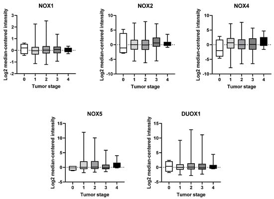 mRNA expression of NOX family at different stages of breast tumor. NOX1, NOX2, NOX4, NOX5, and DUOX1 were evaluated across tumor staging of breast tissues. Data were obtained from the cBioPortal online platform (http://www.cbioportal.org/, accessed on 3 July 2022) (N = 1904).