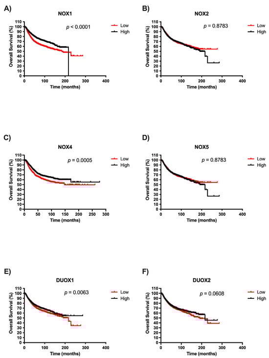 The significance of the prognosis in BC patients with different levels of NOX isoforms was performed using the Kaplan–Meier database (http://kmplot.com/analysis/, accessed on 15 August 2022). The BC database was established using gene expression data and survival information from 876 patients. Individual genes (NOX1, CYBB NOX2, NOX4, NOX5, DUOX1, and DUOX2) were evaluated on the platform. The patient cases were divided into two groups according to the median expression of the gene (high vs. low expression). The survival of patients in both groups was then analyzed using the Kaplan–Meier survival graph. A p-value less than 0.05 was considered statistically significant. The data were downloaded as text, which was replotted.