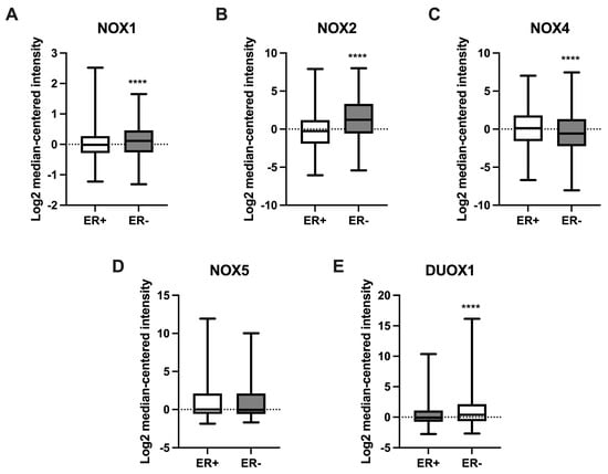 Expression of NOX family genes in relation to estrogen receptor (ER) status in BC samples. mRNA levels of NOX1 (A), NOX2 (B), NOX4 (C), NOX5 (D), and DUOX1 (E) in relation to the presence (ER+) or absence (ER-) of ER in tumor breast tissues. Data were obtained from the cBioPortal online platform (http://www.cbioportal.org/, accessed on 3 July 2022). N = 1904. **** p < 0.0001.