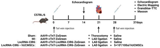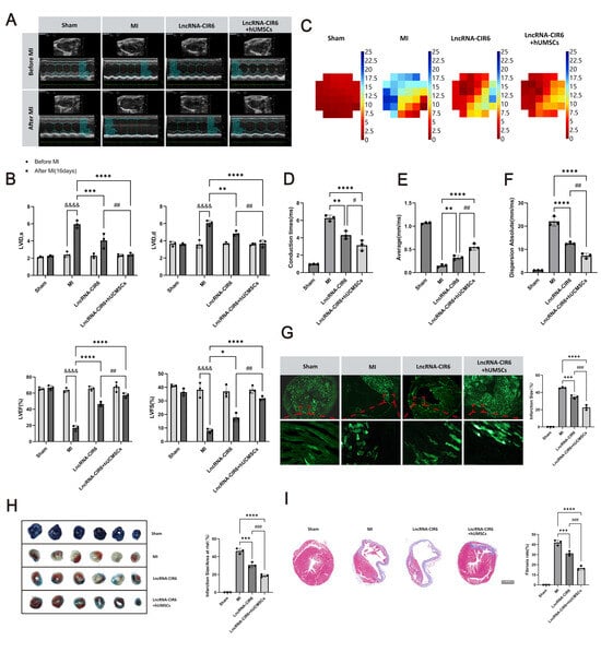 2.2. The Effects of LncRNA-CIR6 or Combined hUMSCs on Heart Function and Cardioprotection In Vivo in Mice with Myocardial Infarction