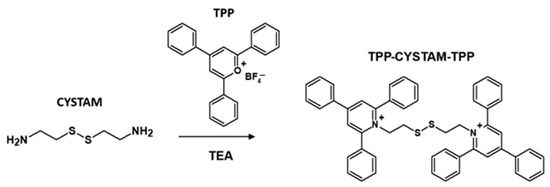 All chemicals were used as supplied. Tetrafluoroborate 2,4,6-triphenylpyrylium (TPP), cystamine dihydrochloride, triethylamine (TEA), dimethylformamid (DMF), acetonitrile (MeCN), water (LC/MS grade), formic acid (HCOOH), trifluoroacetic acid (TFA), hydrochloric acid (HCl) and sulfuric acid (H2SO4) were purchased from Sigma-Aldrich (St. Louis, MO, USA).