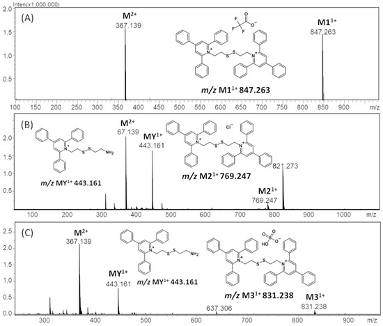On the obtained MS/MS spectra, one of the most characteristic is the signal at m/z 308.143 (Figure S1A–C), corresponding to the protonated form of 2,4,6-triphenylpyridine, which was previously described as a reporter ion generated during the fragmentation of TPP-derivatized peptide [18]. The second part of the molecule that remained after dissociation contains the positively charged quaternary nitrogen atom, which should be neutralized by the presence of a TFA− (Figure S1A), Cl− (Figure S1B) or HSO4− (Figure S1C) anion if the formed adduct is stable in the gas phase. However, the obtained mass spectra present other signals that correspond to charged fragment ions with a higher mass than those resulting from (TPP)2-CYSTAM molecule fragmentation.