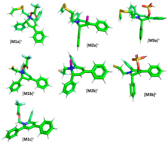 Similarly to the [M1a]+ ion, the [M1b]+ (Etot = −1944.024176 hartree) consists of a well-defined single bond between N and O atoms with a length of 1.475 Å. The fully optimized structure of the [M1b]+ ion is presented in Figure 6, and Cartesian coordinates can be found in the Supplementary Materials (Table S3). The [M1c]+ ion, with Etot = −1506.601239 hartree, differs substantially from the longer [M1a]+ and [M1b]+ ions. Rather than via N–O, the TFA part is connected to the TPP through a carbon atom as presented in Figure 6. The C–O bond length (1.411 Å) is typical for a single bond between O and C. Please see the complete structure parameters of the [M1c]+ in the Supplementary Materials (Table S4).