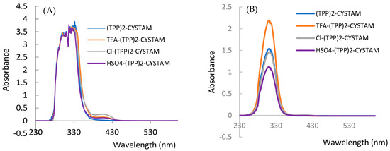 To investigate the possible absorbance properties, we performed UV–Vis analysis and combined it with fluorescent analysis because application of both techniques helps to obtain more information about an analyzed compound. Figure 7A,B show the absorption spectra of bisquaternary ammonium dication and its adducts with TFA−, Cl− and HSO4− anions for TPP solutions of 10−3 mol/L and 10−4 mol/L, respectively.