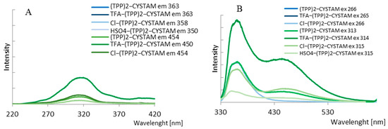 The effect of the TFA anion indicates a very sensitive “turn-on” luminescence response of (TPP)2-CYSTAM for TFA in solution. Moreover, detection can also be carried out based on the increase in intensity and change in profile of excitation spectra by monitoring emissions at different wavelengths. A very low concentration of TFA results in a drastic change in the excitation spectrum profile, with an increase in intensity and range toward lower energies up to 455 nm, and also the appearance of new bands with maxima of 282, 359 and 410 nm (for λmon = 466 nm; Figure 15A). Figure 15B presents the changes in intensity and profile of excitation spectra for λmon = 403 nm and 366 nm.
