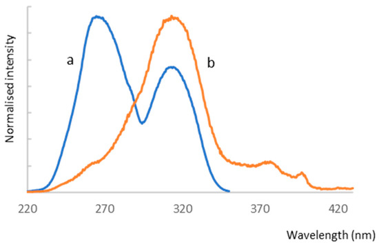 Excitation spectra of (TPP)2-CYSTAM. Concentration 1.37 × 10−5 M. λmon for a = 363 nm and b = 450 nm.